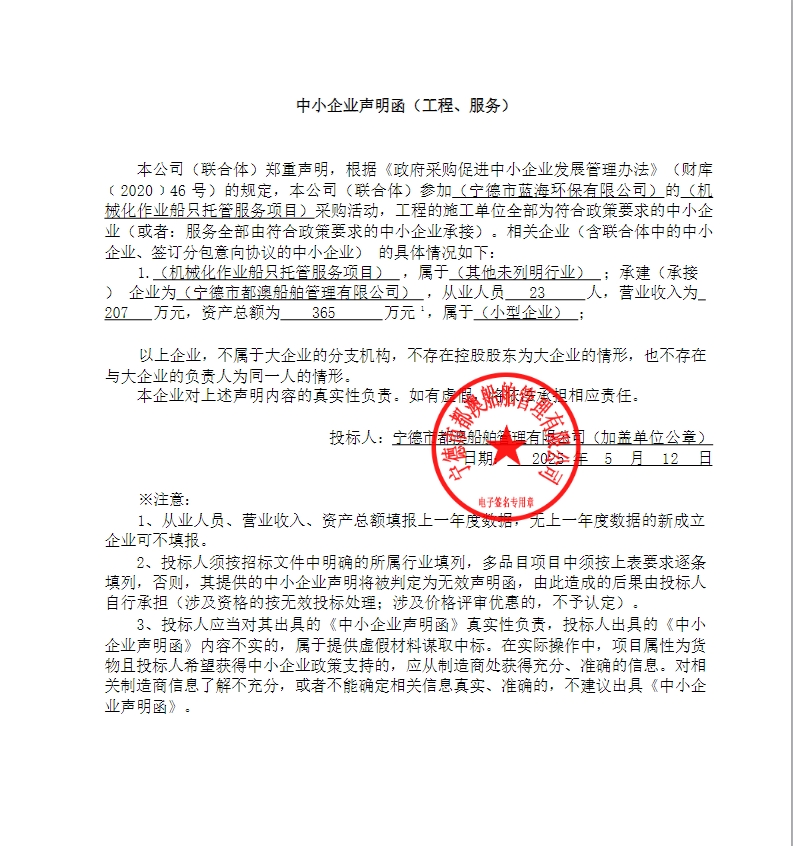 本項(xiàng)目為機(jī)械化作業(yè)船只托管服務(wù)項(xiàng)目,地址為寧德市全海域,委托代管采購人自有四艘機(jī)械化作業(yè)船只,根據(jù)采購人作業(yè)安排在寧德市三都澳內(nèi)、福鼎市指定海域開展巡航海漂垃圾打撈工作等,具體詳見中標(biāo)人投標(biāo)文件 |
